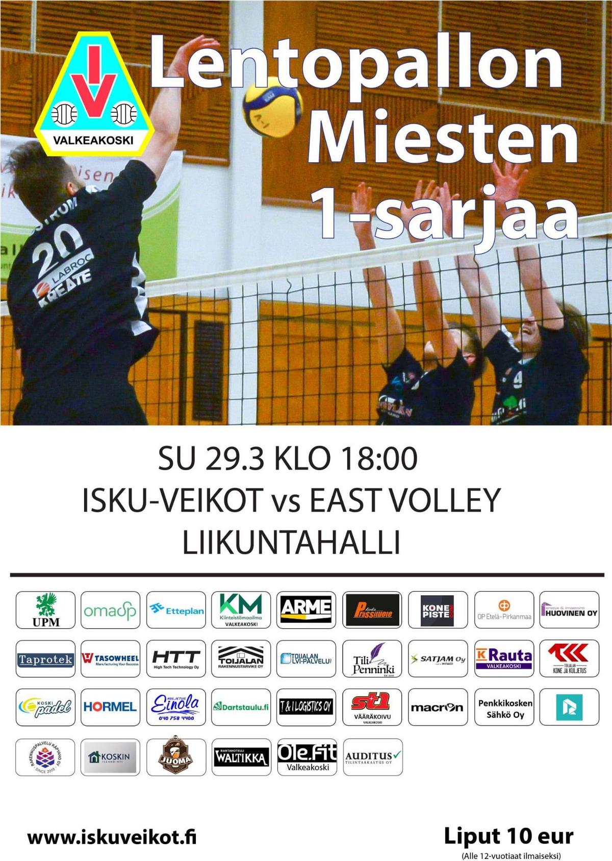 Isku-Veikkojen uuden tulemisen ensimmäinen kausi miesten 1-sarjassa lähenee loppuaan. Mollivoittoisen runkosarjan jälkeen Veikot pääsevät taistelemaan vielä sarjapaikastaan putoamiskarsinnoissa Savonlinnan East-Volleyta vastaan. Ottelusarjassa pelataan kaksi ottelua, ja voittojen mennessä tasan ratkaiseva kultainen erä toisen ottelun jälkeen. Ensimmäinen peli pelataan Apialla tulevana sunnuntaina 29.3 klo 18.00 ja toinen Savonlinnassa seuraavalla viikolla 5.4 klo 13.00.
